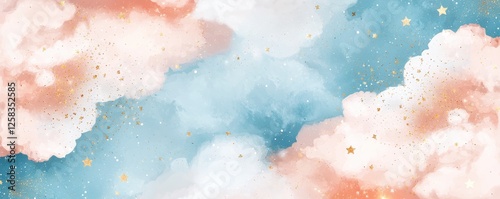 A dreamy watercolor background with tiny pastel stars, fluffy clouds, and delicate golden accents scattered throughout