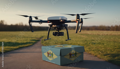 A drone flying with a package, illustrating the transformation of the shopping experience in Delaware.