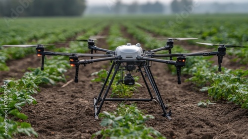 A drone hovers over a lush green crop field, capturing data on plant health and soil conditions in a rural setting on a clear afternoon. Farmers utilize technology for better yields.