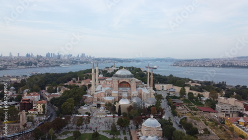 A drone shot of the Hagia Sofia, Istanbul with the Bosphorous looking Northwards in the Background.