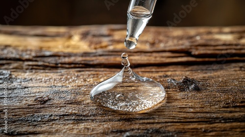 A drop of distilled water falling from a pipette onto a smooth, driftwood surface.