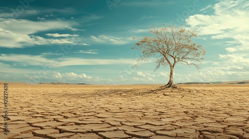 A drought-stricken landscape with a withered tree, leaving plenty of space for text in the barren scene.
