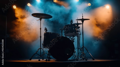 A drum set on a stage with spotlights and smoke.