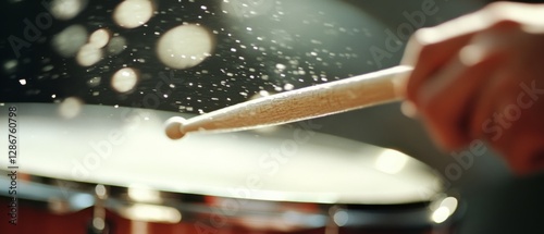 A drumstick strikes a snare drum, sending water droplets airborne in a burst of energy under dramatic lighting.
