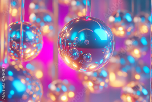 A dynamic 3D abstract background showcasing an array of floating, iridescent metallic spheres, suspended in a vast digital expanse. The reflections and glowing neon highlights create a visually