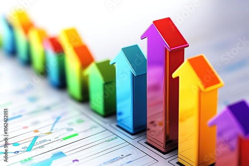 A dynamic 3D up arrow formed by multiple vibrant colors, showcasing a sense of movement and growth