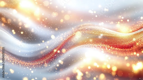 A dynamic abstract background with soft white bokeh lights, intertwined with gold and red glitter stars, creating a festive and sparkling atmosphere with depth and warmth.