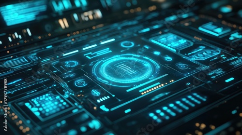 A dynamic and glowing blue and green HUD interface with futuristic data visualizations and digital symbols, representing the cutting-edge of technology