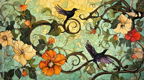 A dynamic Art Nouveau mural depicting flowing vines, birds, and flowers in a harmonious blend