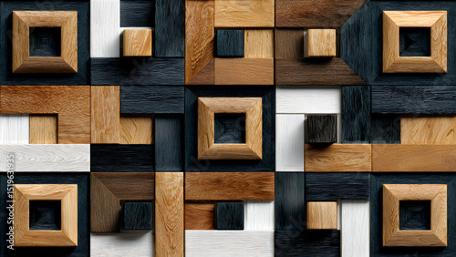 A dynamic blend of wooden blocks arranged in an abstract geometric mosaic pattern.