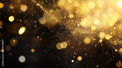 A dynamic cloud of golden glitter dust shimmering brightly against a deep black background. The sparkling particles create a sense of luxury and festive joy,