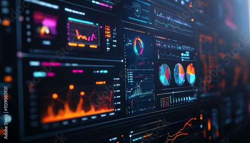 A dynamic digital dashboard displaying wind energy performance metrics, colorful data visualizations, futuristic style, sharp details, ultra HD rendering