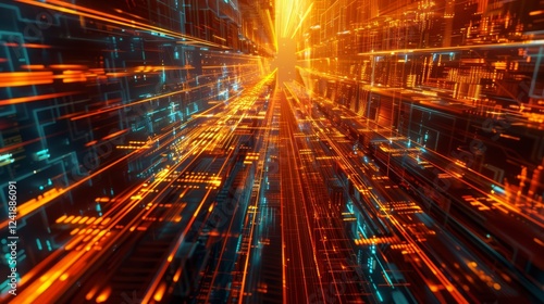 A dynamic digital tunnel with glowing orange and blue light trails, symbolizing data flow, speed, and futuristic technology in a cyberpunk-inspired network