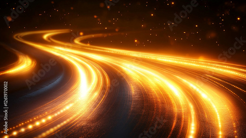 A dynamic, futuristic concept of light speed with glowing neon gold and brown hues, representing digital advancement, speed, and technology, with a clean, blurred background offering space for text