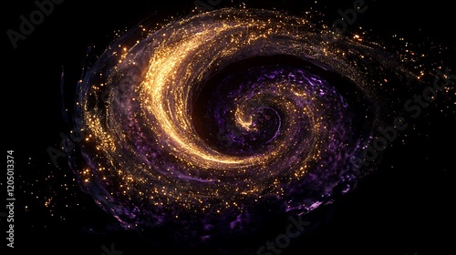 A dynamic galaxy spiral with glowing golden and purple particles creating a cosmic vortex effect