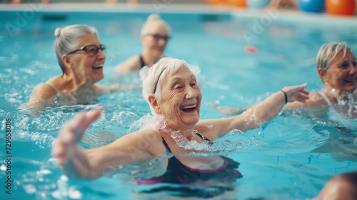 A dynamic group of women gracefully glide through the crystal blue water, their beaming faces and brightly colored swim caps adding to the lively atmosphere of this outdoor leisure centre