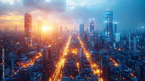 A dynamic, high-tech city glowing with pulsing light from communication hubs as data flows seamlessly through the network. The neon-lit streets and skyscrapers pulse with energy,