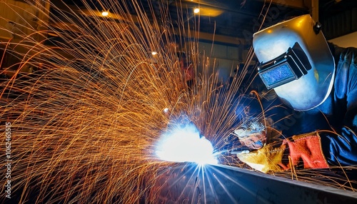 A dynamic image of skilled welders in action, showcasing sparks flying and the intense focus of the professionals as they expertly fuse metal components together in a bright workshop