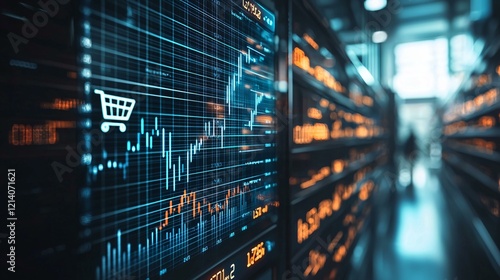 A dynamic office environment with a digital screen showing a sales chart climbing, with a shopping cart icon positioned on the side