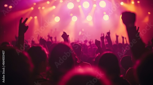 A dynamic photo showcasing a diverse crowd silhouetted against vibrant stage lights as they enthusiastically cheer during a concert