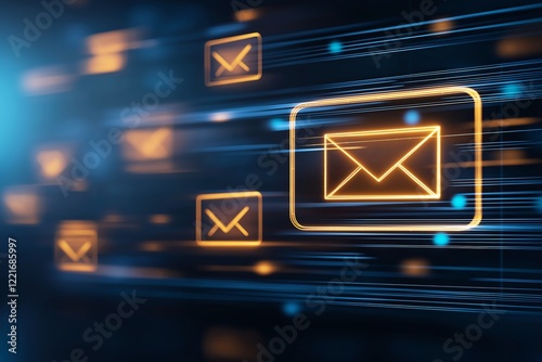 A dynamic representation of digital communication with glowing email icons and light trails, illustrating the speed and efficiency of modern messaging in a virtual world.