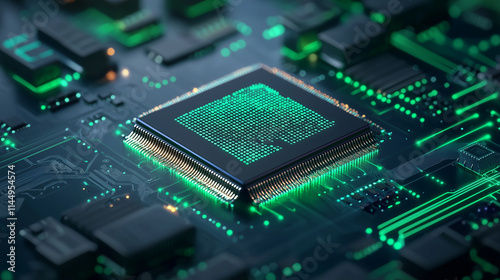 A dynamic scene depicting a glowing algorithm with flowing binary code, a technology processor at the center. The background is filled with deep blue and green hues, evoking a sens