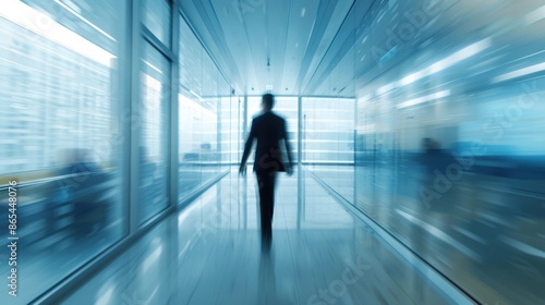 A dynamic shot of a business leader walking confidently through a corporate hallway, with motion blur adding a sense of urgency