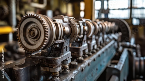 A dynamic shot of a vintage engine, with rotating pistons, cogs, and gears, creating a powerful mechanical atmosphere in an industrial setting.