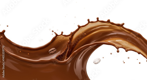 A dynamic splash of chocolate with scattered coffee beans on a stark black and white background