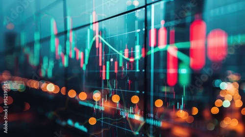 A dynamic stock market graph showcased on a digital screen with colorful charts, data metrics, and city lights in the background.