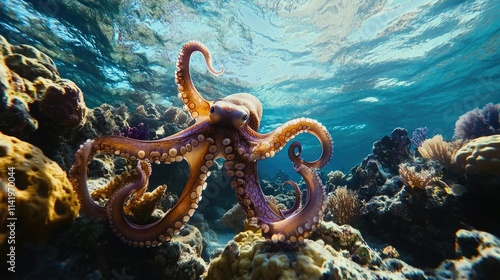 A dynamic underwater photo of an octopus extending its tentacles to explore a reef in pristine waters