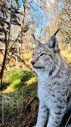 A Eurasian lynx in its natural habitat in Norway, surrounded by golden grass, bare trees, and a clear blue sky. The lynx’s tufted ears and spotted fur are highlighted in this autumn woodland scene.
