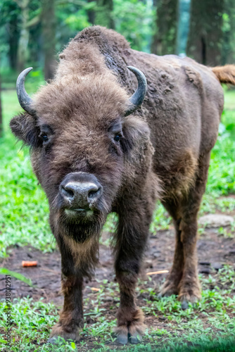 A European bison stands alone. It is one of two extant species of bison. European bison were hunted to extinction in the wild in the early 20th century.