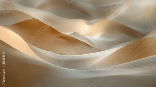 A fabric landscape with intricate patterns, resembling sand dunes in a serene desert, folds captured with dramatic lighting