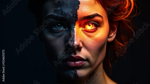a face divided into two halves, symbolizing the contrast between good and evil, with one eye like a bright sun, emphasizing duality and intensity.