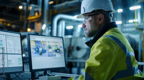 A factory safety officer monitoring the safety performance metrics on a computer screen,copy space. Generative ai illustration.