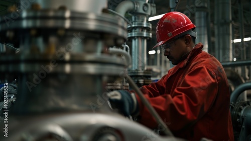 A factory worker, clad in red protective gear, stands focused at machinery, embodying dedication and precision in a complex industrial environment.