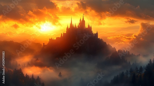 A fairy-tale castle in silhouette, perched atop a rugged mountain, surrounded by rolling mist, with a warm sunset casting golden light across the sky, creating a mystical atmosphere. --ar 16:9