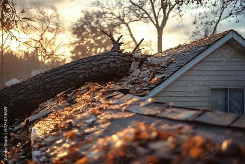 A fallen tree on a house roof symbolizes the aftermath of a natural disaster, highlighting the need for disaster recovery and emergency response,