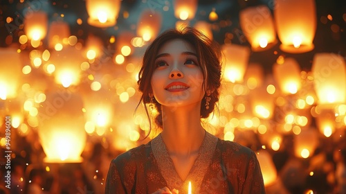 A family joyfully lights and releases paper lanterns, creating a beautiful display against the night sky during a celebration.