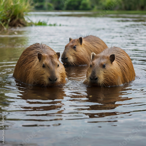 A family of capybaras relaxing at the edge of a river, some submerged in the water with only their eyes and nostrils showing. Natural lighting, serene atmosphere.
