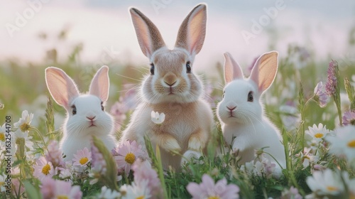 A family of rabbits inside a circle of wildflowers, a minimalist studio shot, an advertising image for cruelty-free cosmetics. generative ai