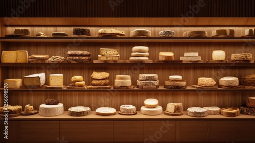 A family-owned cheese shop with wooden shelves displaying aged cheeses and tasting boards. Copy space.
