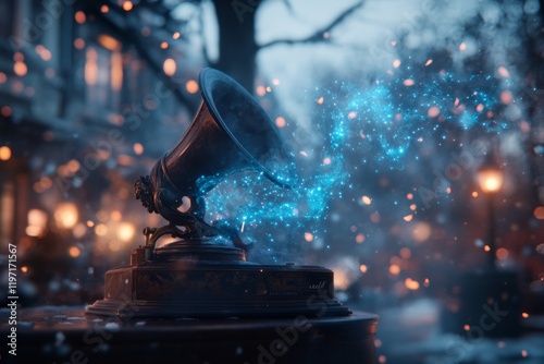 A fantastical depiction of a vintage gramophone emitting glowing, magical notes that swirl and illuminate the room, creating a whimsical atmosphere