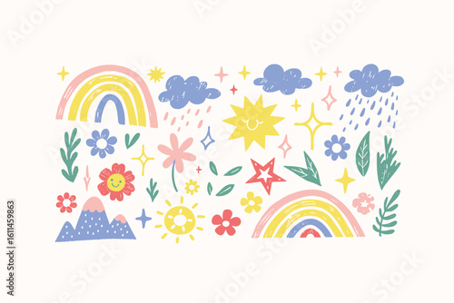 A fantasy land drawn in childlike colors featuring nature scenes, weather patterns, smiling plants, and sparkly doodles that feel like an illustrated daydream.