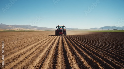 A farmer driving a tractor through a plowed field, with freshly turned soil and a clear blue sky above, ready for the next planting.