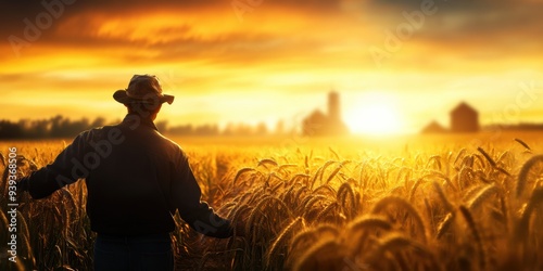 A farmer stands thoughtfully amidst golden wheat fields at sunset, reflecting on the day?s labor as the sun dips behind distant barns, capturing a moment of peace and gratitude.