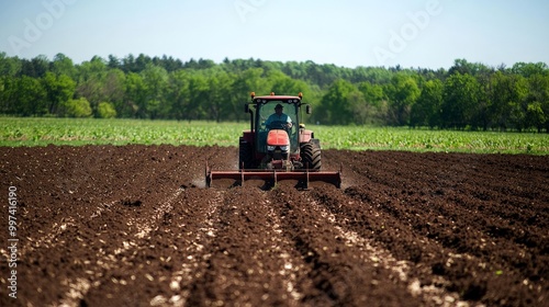 A farmer tilling a field with a tractor, turning over rich, dark soil under a clear blue sky
