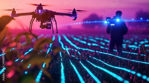 A farmer uses a drone to inspect crops at sunset. The drone is flying over a field of crops, and the farmer is standing in the field looking at the drone.