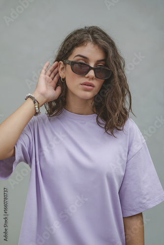 A fashion portrait photograph against a plain light gray background. The subject wears a loose-fitting lavender t-shirt and dark sunglasses.